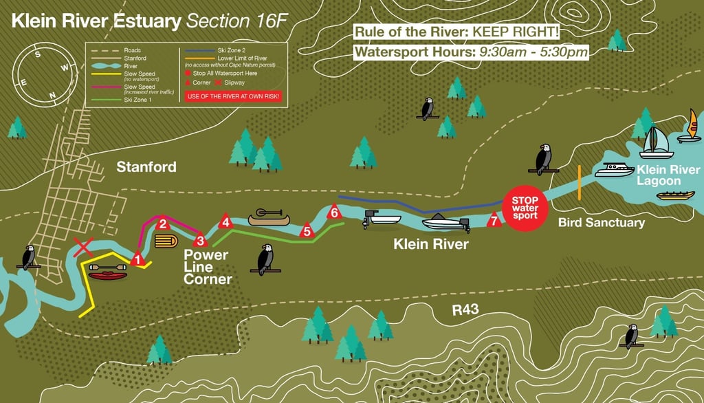 Powerboats may not enter the demarcated bird sanctuary at the downstream end of the river.